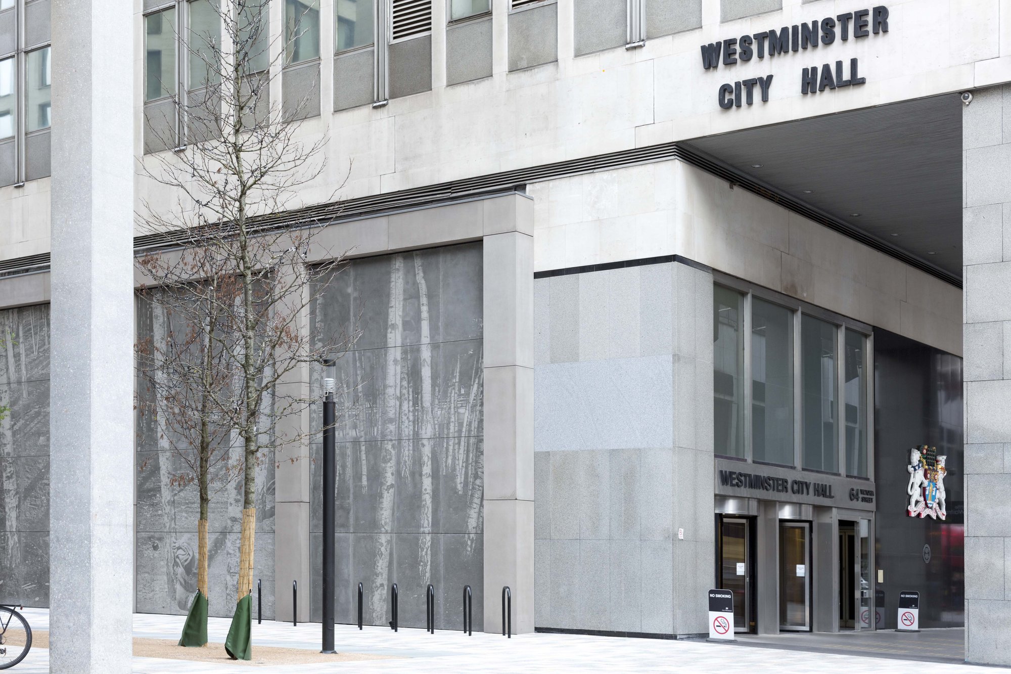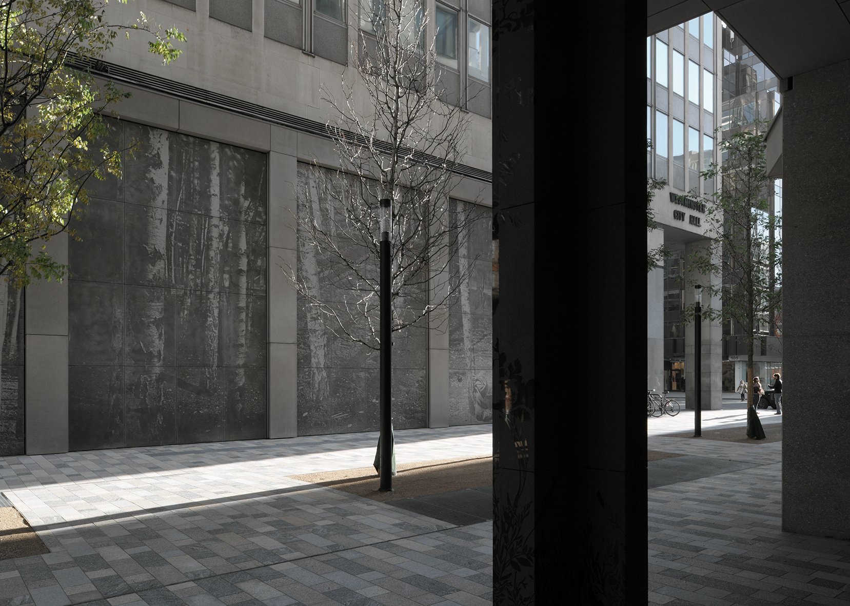 Silver Forest is a 30m long 8m tall concrete artwork made in collaboration with the artist Rut Blees-Luxemburg and cast by Graphic Relief. It sits on the side of Westminster City Hall in a new public passage called Kings Gate Walk, across from the entrance colonnade of Kings Gate, a residential project that we designed on Victoria Street, London SW1. The demolition of the previous building that abutted City Hall revealed a scar of brick work, and our task was to create a suitably ornamental base to this august institution, one that did not upstage the somewhat dour 1960s building that it adorns. The scale and rhythm of the columns forming the portico to City Hall wrap around the corner, drawing you into the new urban passage and establishing also a powerful relationship with Kings Gate. Silver Forest is a series of photographs cast into concrete, with varying degrees of texture and focus, blur and sheen, that variously coalesce into a focussed image of a path in a forest; or fragment into parts of trees, becoming pure texture. The concrete surfaces echo and re-present the textures of the Birch bark depicted in the photographs, resonating strongly with the bark of the actual Acer trees in the courtyard. Nature, second nature, artifice, and decorum combine in a powerful spatial experience of illusionistic and actual depth, adding a layer of civic presence to the otherwise modest and somewhat mute City Hall.